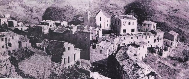 Les ruines de l’ancien village après le séisme, au premier plan le nouveau village