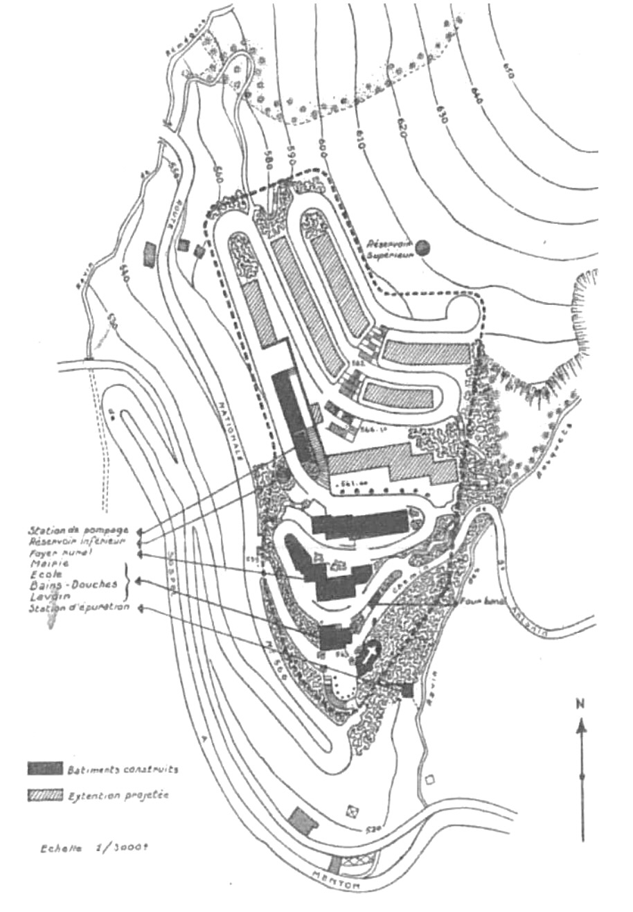 Le terrain, en nature de broussailles, comportait une déclivité très prononcée. La charge d’établir le projet de reconstruction et d’aménagement du village et les projets de reconstruction des immeubles sinistrés fut confiée à un homme de l’art, M. Richard Laugier, architecte et urbaniste.