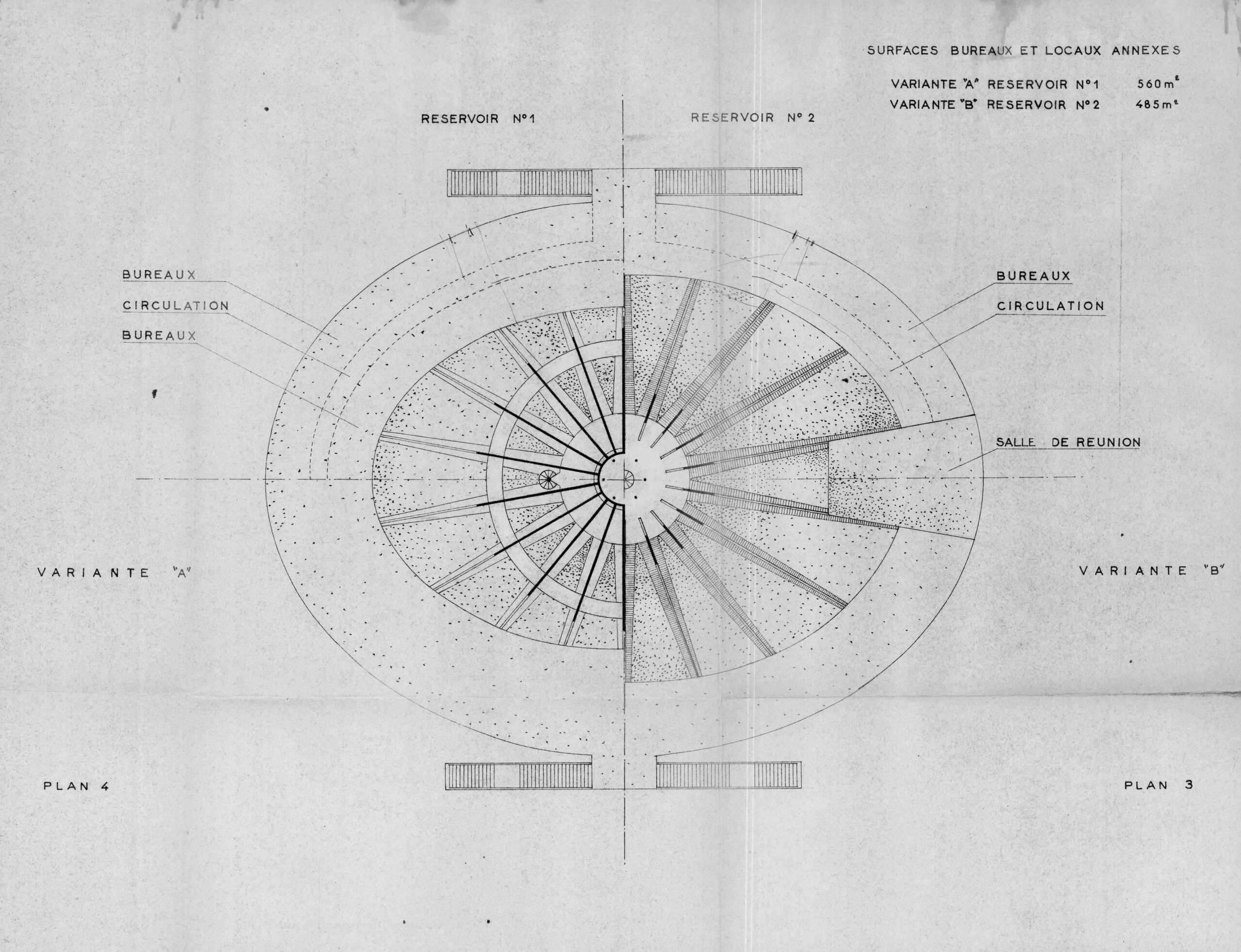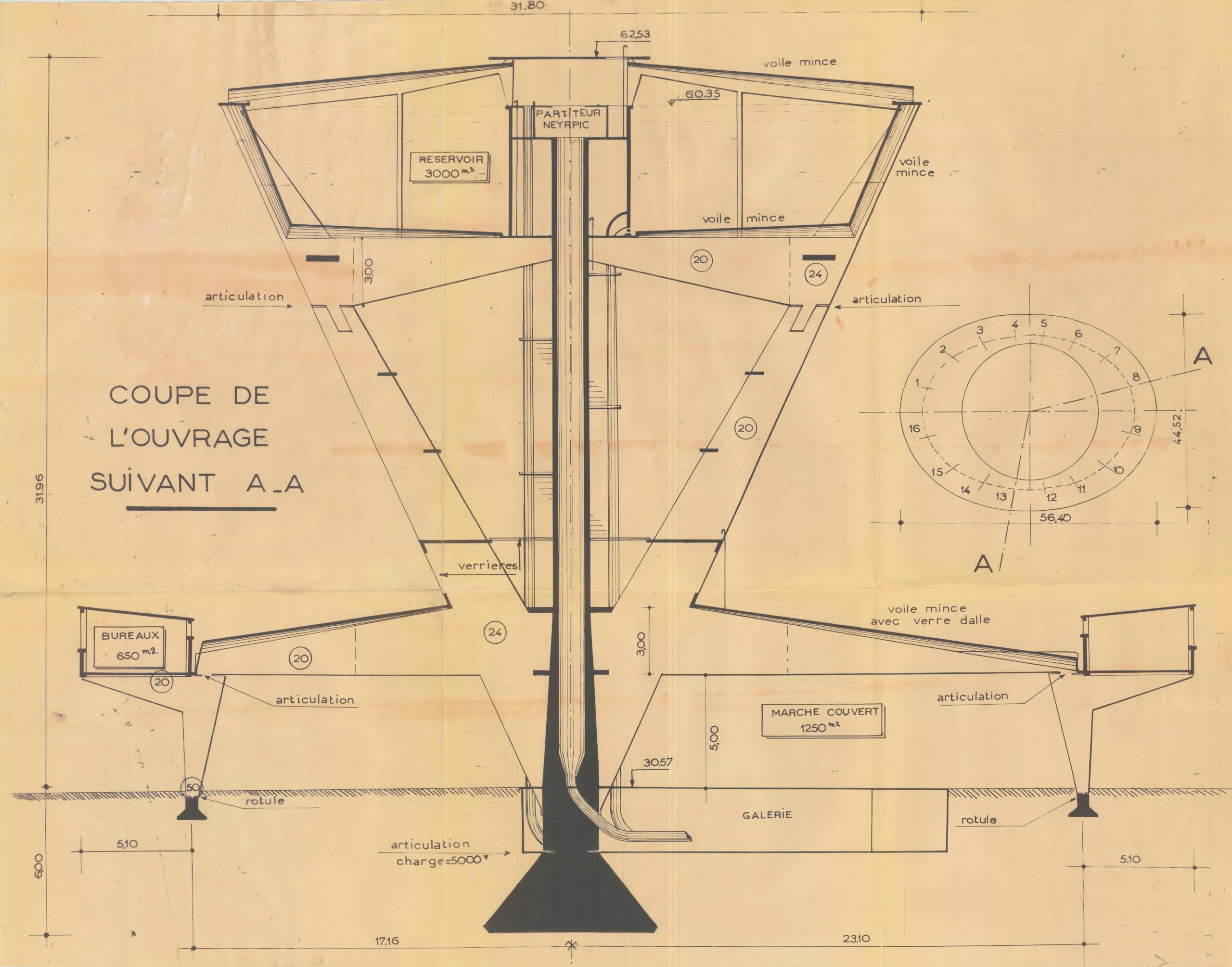 Le réservoir est un tronc de cône placé au sommet de l’édifice reposant sur une structure portante composée de voutains en béton armé en forme de cône reportant les charges et les surcharges sur les poteaux du faisceau structural. Le marché couvert se situe au niveau inférieur sur la dalle de la place. Le centre administratif est logé dans la galerie circulaire reposant à la périphérie du toit du marché couvert.