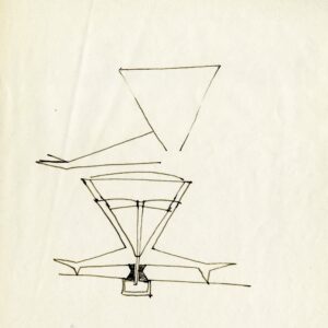 Il fallait donc faire tenir un cône sur sa pointe, c’est-à-dire en assurer l’équilibre par des poutres rayonnantes de la couverture venant prendre appui sur des poteaux périphériques. Ce que Guillaume Gillet à résumer par ce croquis :