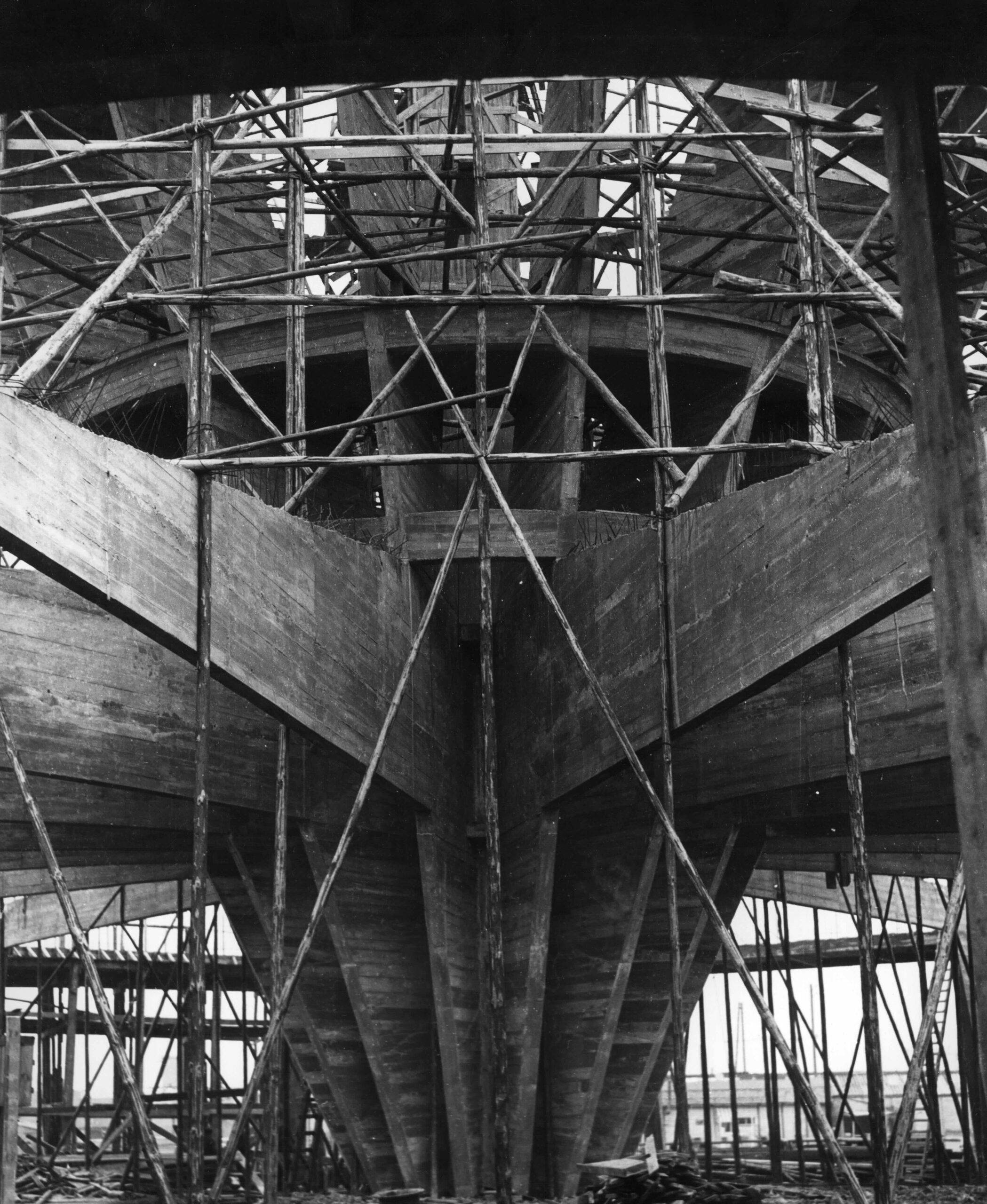Les couvertures du réservoir et du marché sont constituées d’une succession de voûtes minces rayonnantes en béton. Les voûtes du marché couvert sont incrustées de pavés de verre pour éclairer naturellement l’espace commercial.